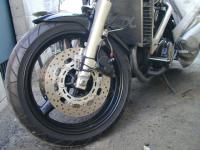フロントホイールを17インチ(YZF-R1の流用)にしています。