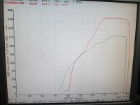 セッティングをしての計測です。STDコンロッド等の強度が心配でしたので240PSに抑えております。ジェットを交換すれば300PSも夢ではありませんが、それなりの対策が必要です。緑の線はNOS装着前のパワー曲線で後軸185PSあります。