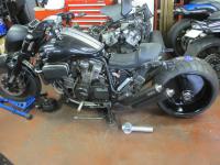 らしく絶対に譲れないとの事で、このサイズを入れるべくスイングアームの長さをオーナーさんと決めて製作します。尚、今回外したボルトオンのV45マグナのスタビ付スイングアームとX−4改ホイールとX−4キャリパー一式を売りたいという事なので興味がある方は一報下さい。