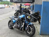 ESPER35mmスタビライザーつきスイングアーム、ゲイルのホイールにブレンボーのキャリバー&マスター、セパハンとアッパーカウルも装着して、同僚達のレプリカ軍団に食らい付いて走ってるオーナーさんです。
